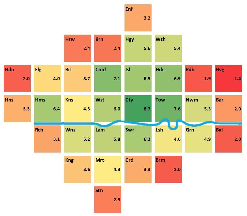 | 5. Low Traffic Neighbourhoods (Modal filters) | Number of modal filters (Source: TfL CID. Data collected 2017-summer 2018)/km of road length (DfT – 2017) | 26th |