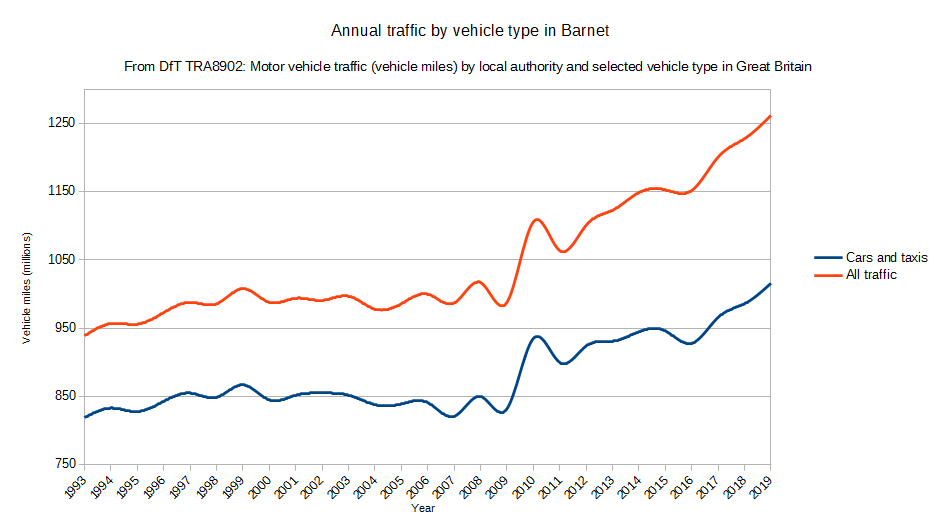 Motor traffic has risen steeply in the last ten years across the country, and Barnet is no exception. Between 2009 and 2019, the number of miles driven on Barnet’s roads rose by 274,000,000 – one of the highest increases in London. 1.26 billion vehicle miles were traveled on roads in Barnet in 2019